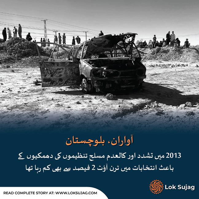 تاہم 2013ء میں اس وقت کے یورپی آبزرور مشن کی رپورٹ بتاتی ہے کہ تشدد کے باعث ضلع آواران کے صوبائی حلقے میں 57 ہزار 666 ووٹوں میں سے صرف 672 کاسٹ ہوئے تھے یعنی ٹوٹل ٹرن آؤٹ 1.18 فیصد تھا۔ ان کاسٹ ہونے والے ووٹوں میں سے عبدالقدوس بزنجو 544 ووٹ لے کر رکن اسمبلی منتخب ہوئے تھے جو بعد ازاں وزیر اعلیٰ بھی بنے۔