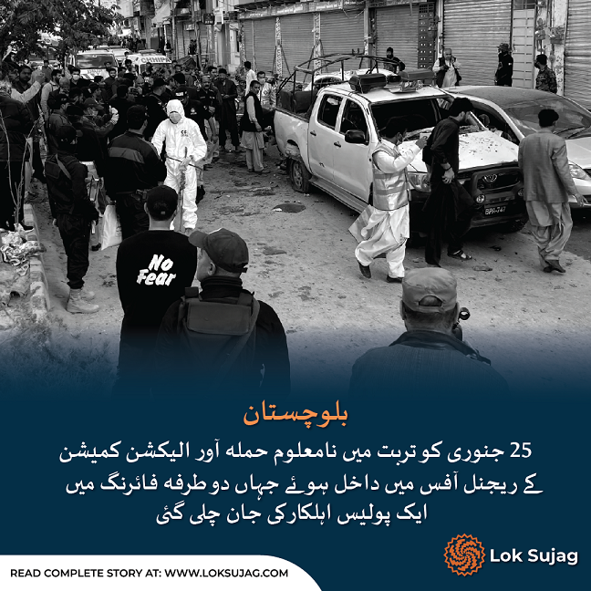 پچیس جنوری كو تربت میں نامعلوم حملہ آور الیکشن کمیشن کے ریجنل آفس میں داخل ہوئے جہاں دو طرفہ فائرنگ میں ایک پولیس اہلکارکی جان چلی گئی۔ اسی شب ضلع سوراب میں دو نامعلوم موٹرسائیکل سواروں نے فائرنگ کی جس میں جے یو آئی كے ضلعی رہنما اور کونسلر حاجی عبد الحمید مینگل جاں بحق ہو گئے۔