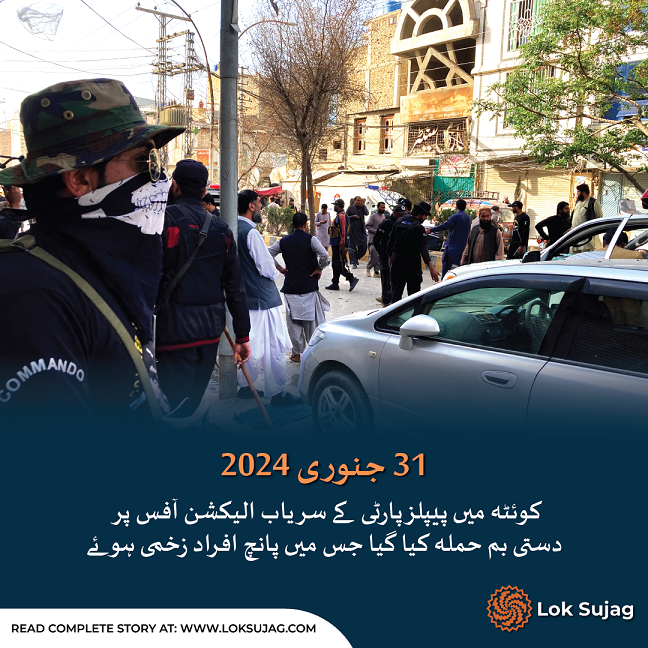 اگلے روز بدھ کو کوئٹہ میں پیپلز پارٹی کے سریاب الیکشن آفس پر دستی بم حملہ کیا گیا جس میں پانچ افراد زخمی ہوئے تاہم پی پی رہنما اور امیدوار علی مدد جتک بال بال بچ گئے۔ اسی دوران کیچ کے علاقے بلیدہ میں پیپلز پارٹی کے امیدوار ظہور بلیدی کے گھر پر دو دستی بم پھینکے گئے تاہم اس میں کوئی جانی نقصان نہیں ہوا۔