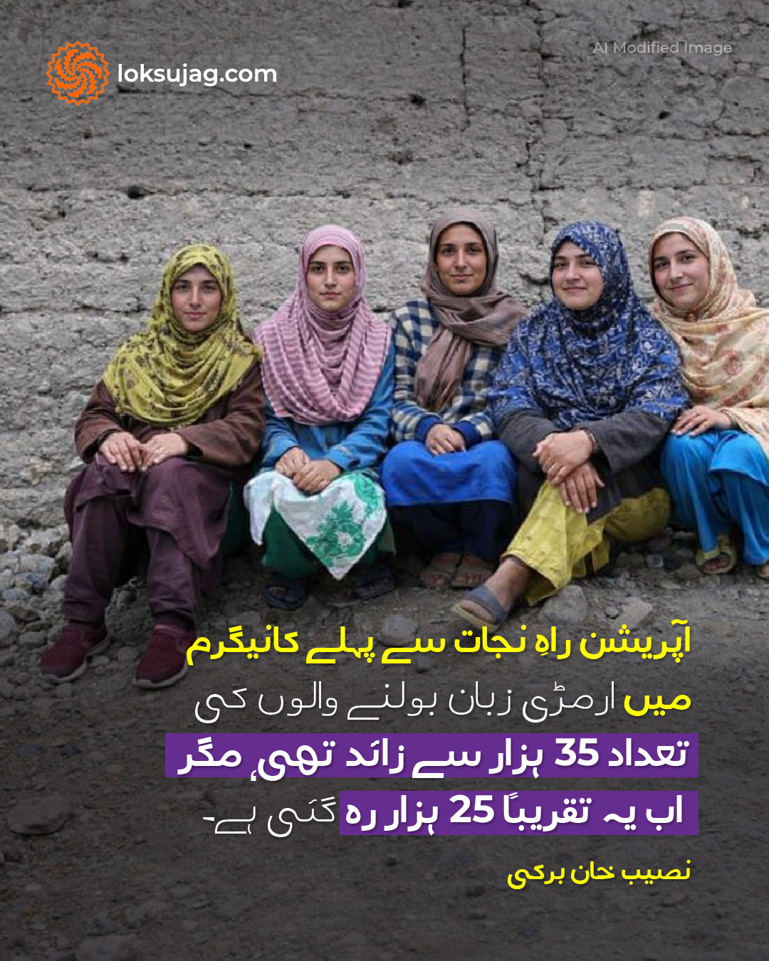 عمر رسیدہ نصیب خان برکی کے بقول آپریشن راہ نجات سے پہلے کانیگرم میں ارمڑی بولنے والے لوگوں کی تعداد 35 ہزار سے زیادہ تھی لیکن اب یہاں لگ بھگ 25 ہزار رہ گئے ہیں۔ ادھر سے جانے والے اکثر اپنی زبان بھی یہیں چھوڑ جاتے ہیں۔