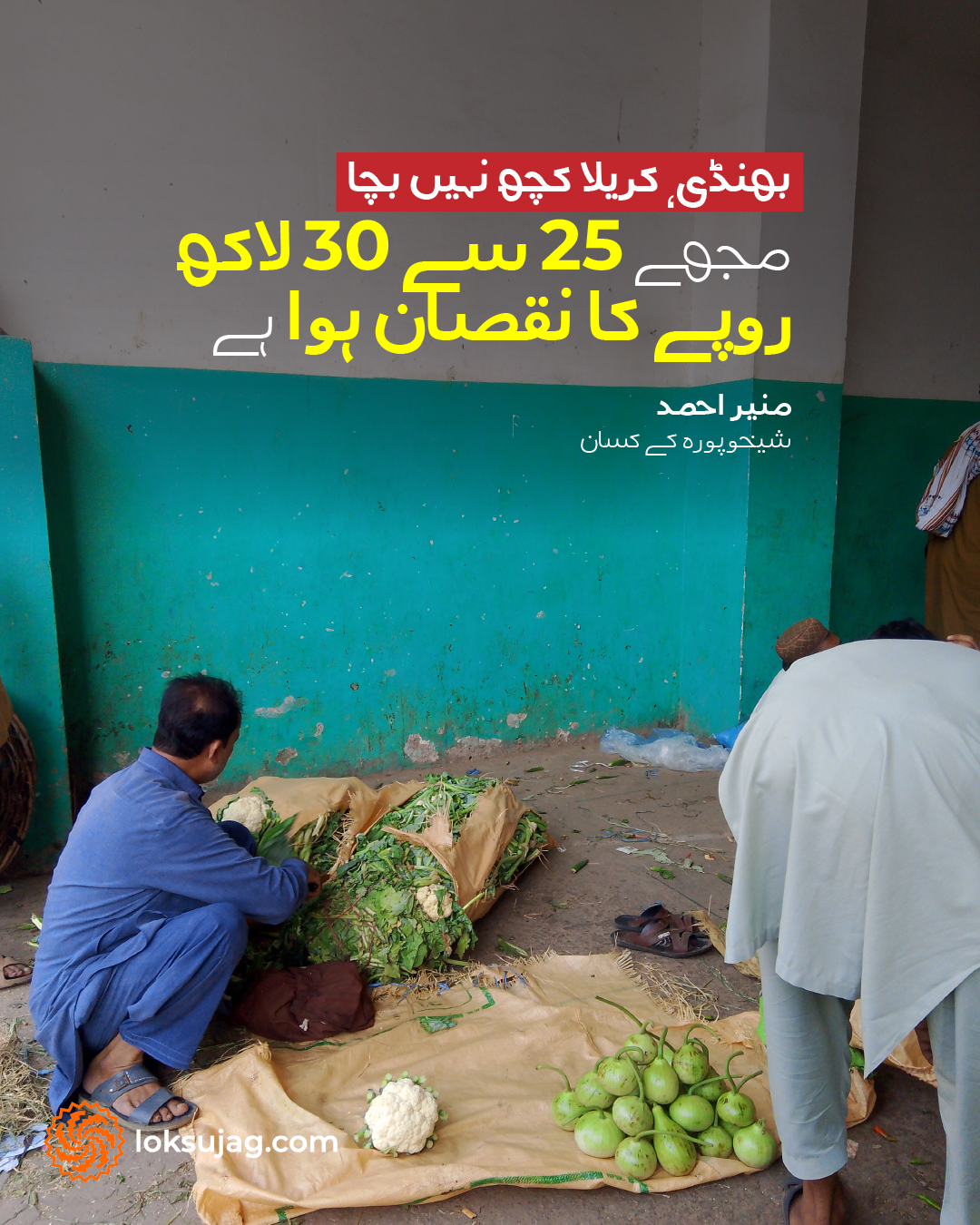 شرقپور کے گاؤں بھولے شاہ کے کسان ملک جہانگیر منظور کی بھنڈی، توری، آلو اور لوکی کی فصل مکمل تباہ ہوگئی۔ وہ بتاتے ہیں کہ یہ سبزیاں روز منڈی جا رہی تھیں اور نرخ کم تھے لیکن اب ان کی قیمتیں آسمان کو چھو رہی ہیں۔