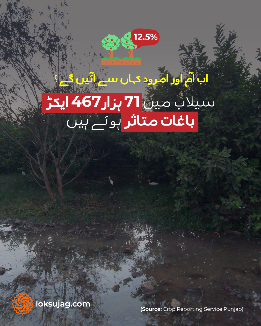 سیلاب نے پنجاب میں سبزیوں کے علاوہ باغات کو بھی طویل مدتی نقصان پہنچایا ہے۔ کراپ رپورٹنگ سروس پنجاب کے مطابق تقریباً 71 ہزار 467 ایکڑ پر لگے باغات متاثر ہوئے جو کل رقبے کا 12.5 فیصد ہیں۔ ان میں سے 64 ہزار 480 ایکڑ آم کے باغات ہیں۔
