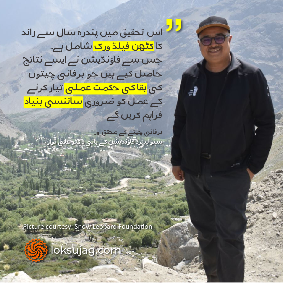 سنو لیپرڈ کے محقق اور سنو لیپرڈ فاؤنڈیشن کے بانی ڈاکٹر علی نواز نے لوک سجاگ کو بتایا کہ اس تحقیقی کام میں پندرہ سال سے زائد کا کٹھن فیلڈ ورک شامل ہے جس سے فاؤنڈیشن نے ایسے نتائج حاصل کیے ہیں جو برفانی چیتوں کی بقا کی حکمت عملی تیار کرنے کے عمل کو ضروری سائنسی بنیاد فراہم کریں گے۔