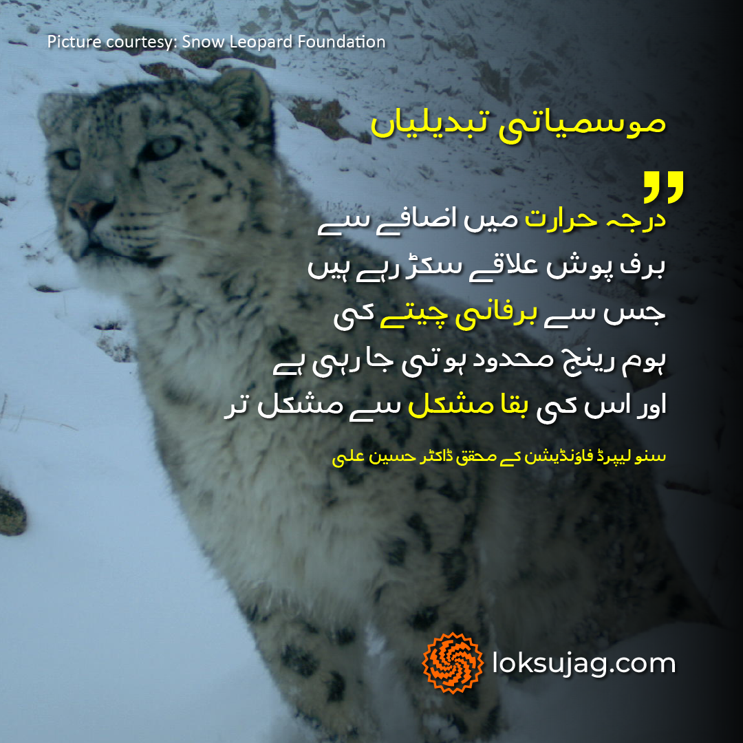 موسمیاتی تبدیلیاں برفانی چیتوں کے قدرتی مسکن کو تیزی سے متاثر کر رہی ہیں۔ سنو لیپرڈ فاؤنڈیشن کے محقق ڈاکٹر حسین علی نے لوک سجاگ کو بتایا کہ درجہ حرارت میں اضافے سے برف پوش علاقے سکڑ رہے ہیں جس سے برفانی چیتے کی ہوم رینج محدود ہوتی جا رہی ہے اور اس کی بقا مشکل سے مشکل تر۔