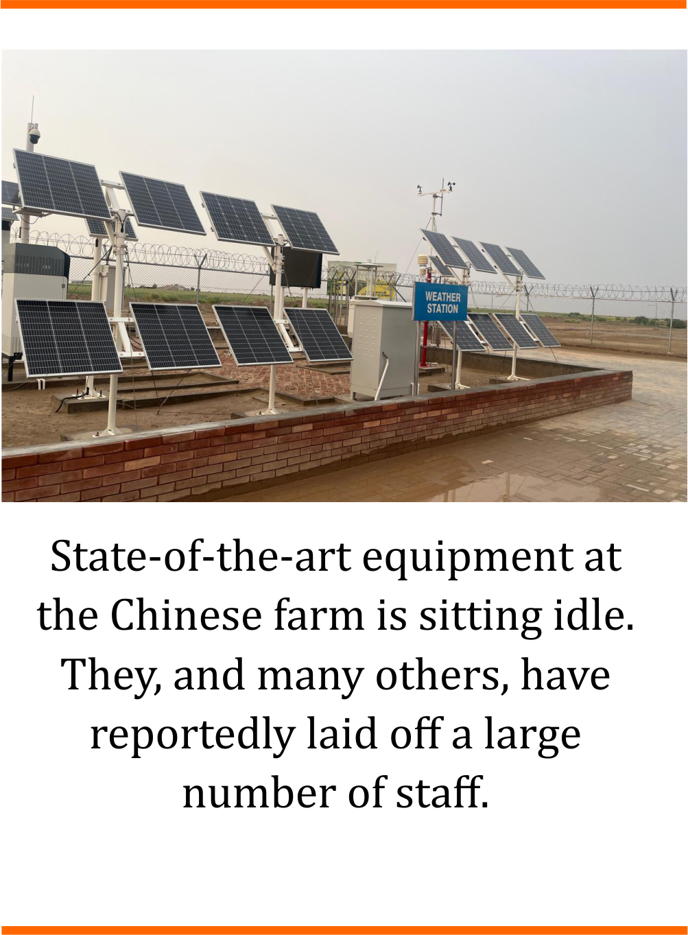 There are reports that Unity Food group, one of the biggest investors with a 50,000-acre farm, is withdrawing from the project. They started with a bang but ended with a whimper. The company posted a video on its YouTube channel a year ago documenting the journey of its imported agricultural machinery all the way from China to its site in Cholistan. Now people in the area tell that the machinery is either gathering dust or has been sold out. Our formal requests to the company representatives for their response remained unanswered.