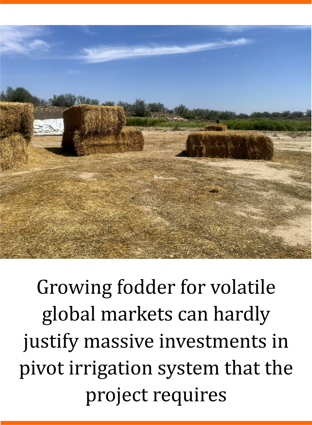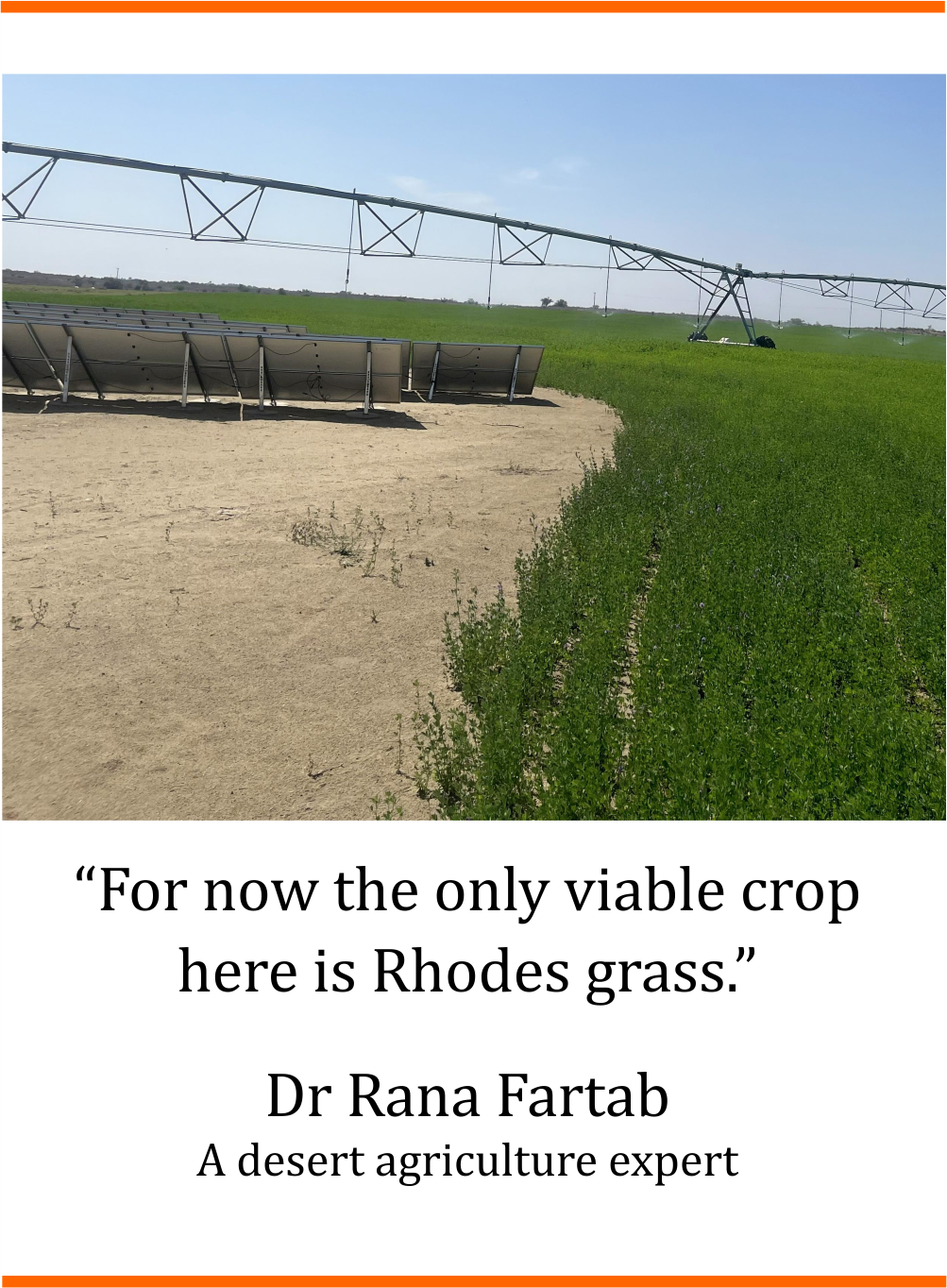 “Without a sustainable water solution, this project will fail,” Mannan made no bones and added that most of the companies still in operation are just hanging on by growing Rhodes and alfalfa - the two grasses used as cattle fodder.