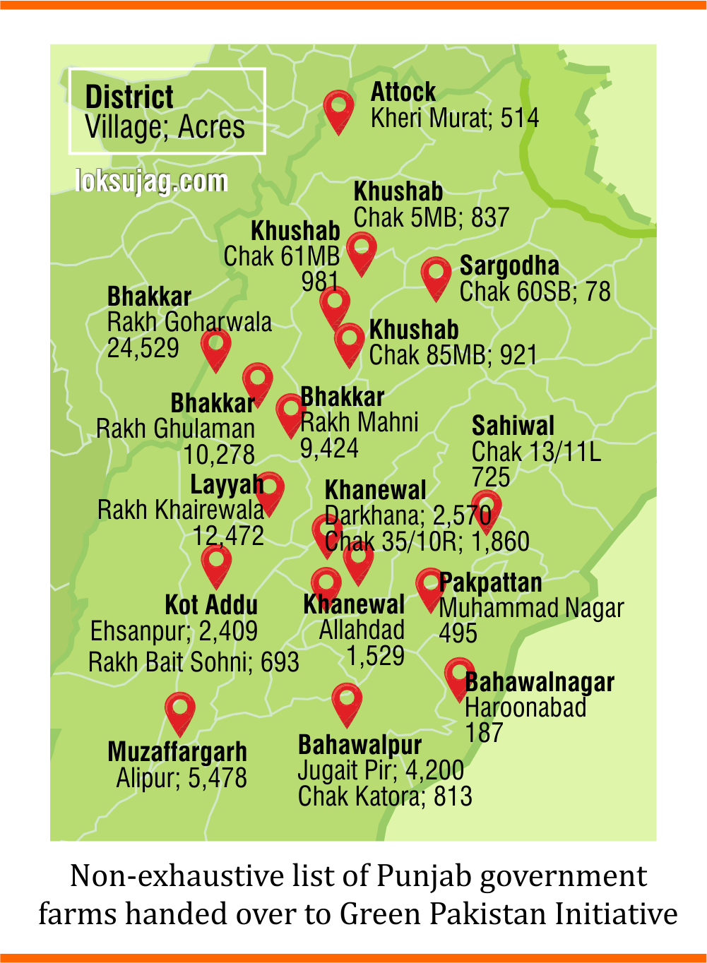 Official documents reviewed by Lok Sujag show that the project teams identified 96,571 acres of land spread across 14 districts for potential handover to the Green Corporate Initiative. The caretaker government of Punjab and the Pakistan Army signed the joint venture agreement on March 8 and the process of transfer of land started immediately afterwards.