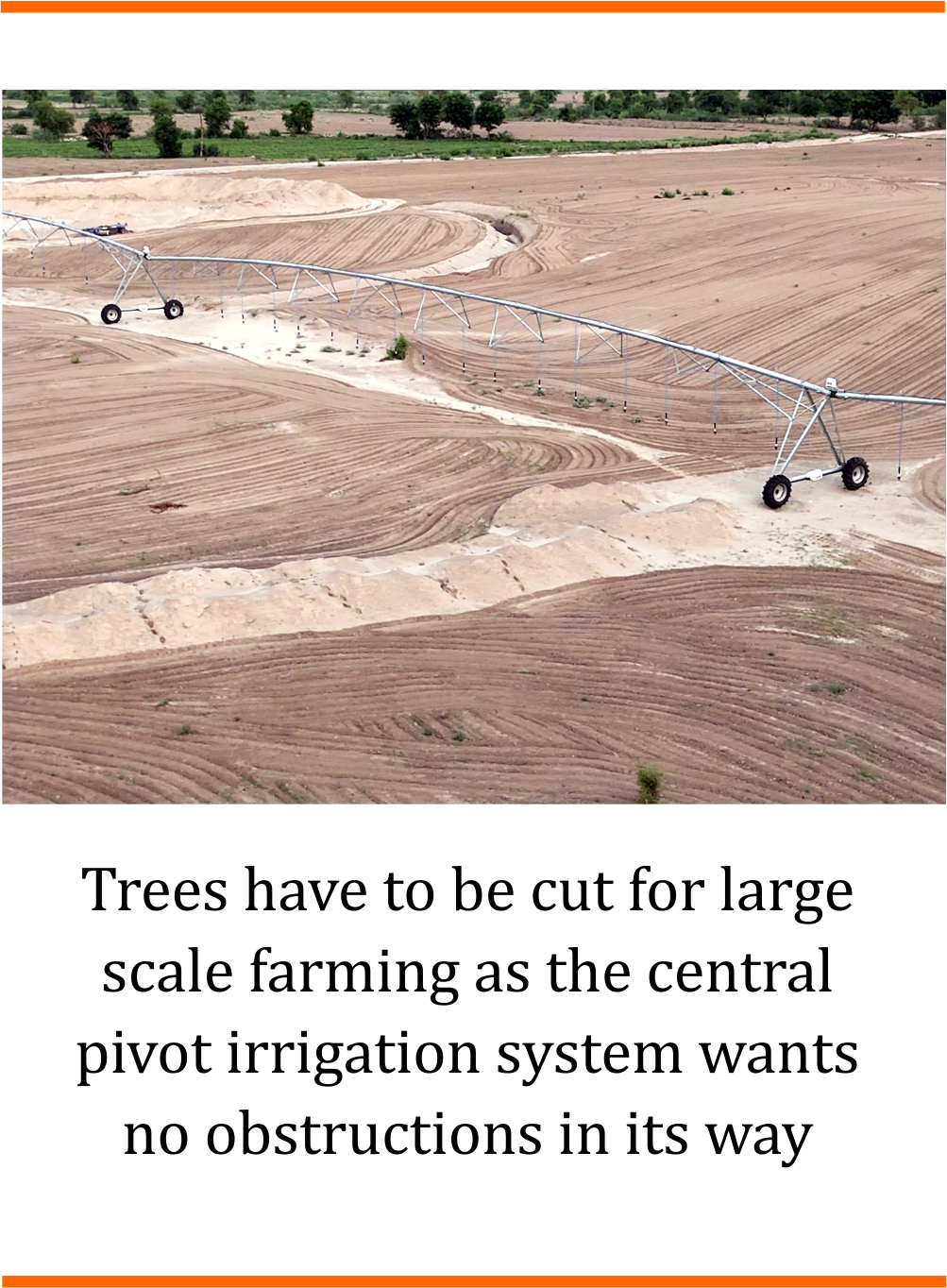 Mustafa argues that the trees had to be cleared to make way for what he calls modern farming. Precision agriculture on a large scale, he continues, requires installation of central pivot irrigation systems. They demand vast, unobstructed fields to function which means that ‘trees have to be sacrificed at the altar of modern corporate farming’.