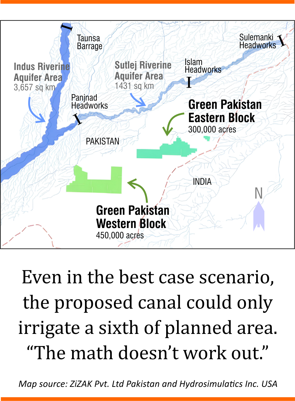 Politics aside, experts believe that the proposed canal could never deliver the required amount of water. It was estimated to carry 4,000 cusec to irrigate 750,000 acres of corporate farms. “Even with efficient pivot irrigation, you need 30 cusecs per 1,000 acres in this climate,” said one agronomist, which means that even in the best-case scenario, the proposed canal could irrigate just 133,000 acres or a sixth of the total planned farm area. “The math doesn’t support the plan,” quipped the expert.
