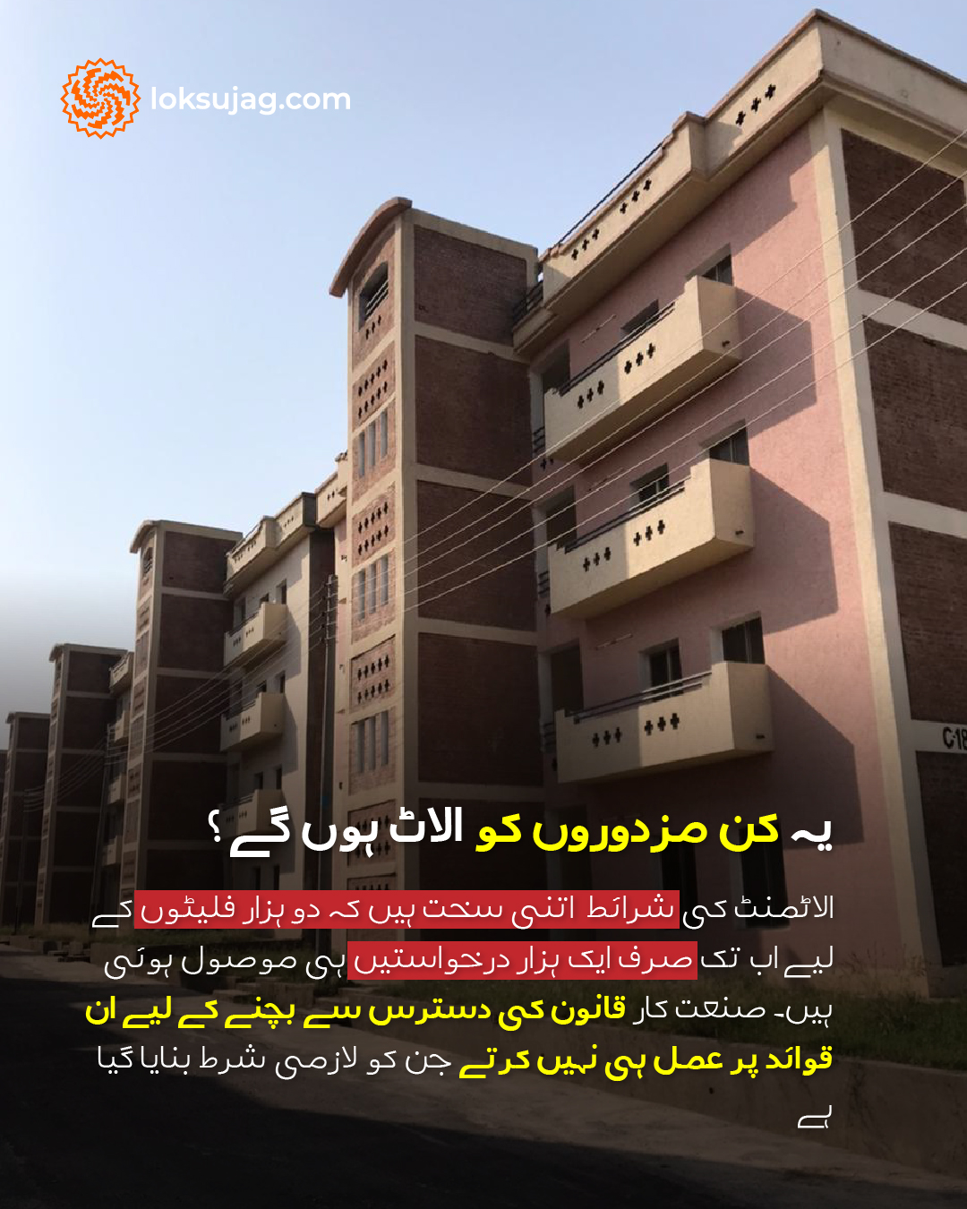 پہلے مرحلے میں ایک ہزار 50 ورکرز کی درخواستیں موصول ہو چکی ہیں، باقی فلیٹس کے لیے بھی جب درخواستیں آئیں گی اسی طریقہ کار کے مطابق الاٹمنٹ ہو گی۔