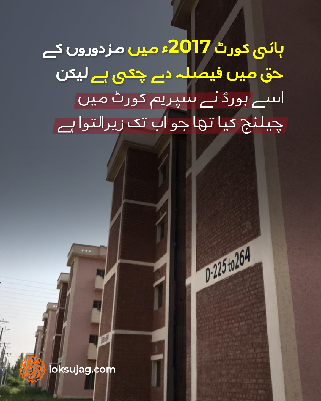 وہ بتاتے ہیں کہ ورکرز نے 2014ء میں بورڈ کی پالیسی کے خلاف پشاور ہائی کورٹ میں درخواست دائر کی تھی۔ عدالت عالیہ نے 2017ء میں ورکرز کے حق میں فیصلے دیتے ہوئے فلیٹس مالکانہ حقوق پر دینے کے احکامات جاری کیے لیکن بورڈ نے یہ فیصلہ سپریم کورٹ میں چیلنج کیا تھا جو اب تک زیرالتوا ہے۔