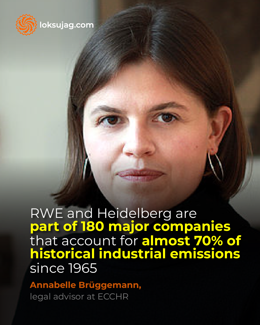 Berlin-based Annabelle Brüggemann is a senior legal advisor at ECCHR. In an online talk with Lok Sujag, she explained: “RWE and Heidelberg are among 180 companies that account for almost 70 percent of historical industrial emissions since 1965. Their individual shares stand at 0.68% and 0.12%, respectively.”
