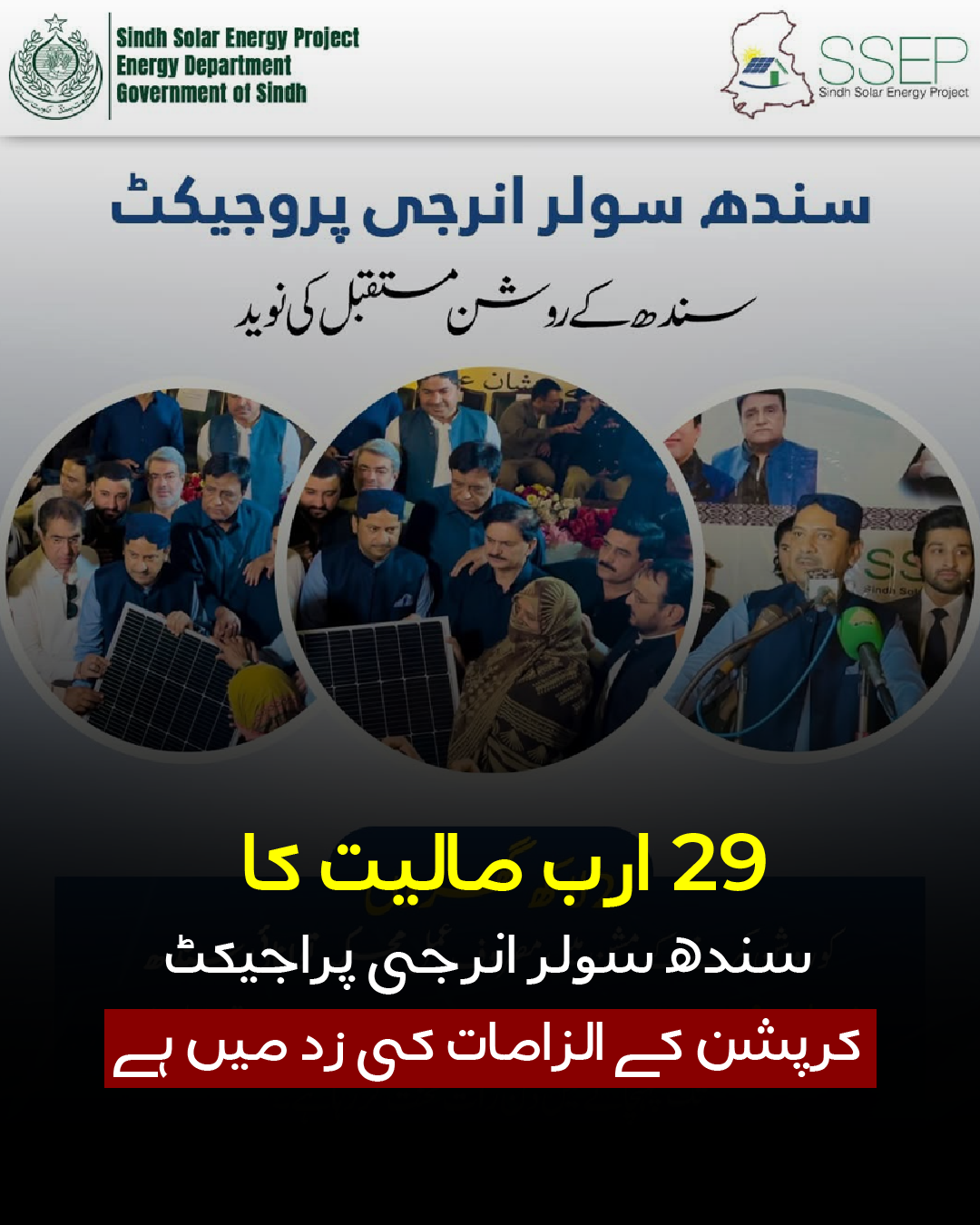 سندھ میں سولر انرجی کو فروغ دینے کے 29 ارب روپے کے منصوبے پر اگست 2025ء سے کرپشن کے الزامات لگ رہے ہیں۔ کہا جاتا ہے کہ پراجیکٹ انتظامیہ نے بجٹ میں سے لگ بھگ 3 ارب روپے خردبرد کیے ہیں۔