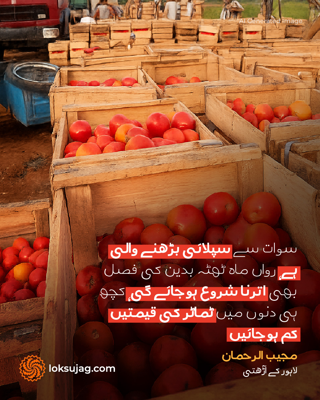 لاہور کے آڑھتی مجیب الرحمان بتاتے ہیں کہ بادامی باغ سبزی منڈی کو روزانہ ٹماٹر کی 30 گاڑیوں کی ضرورت ہوتی ہے لیکن ایک ہفتے سے یہاں 15 سے 20 گاڑیاں ہی آرہی ہیں۔ طلب پوری نہیں ہو پارہی اسی لئے ریٹ بڑھ رہے ہیں۔