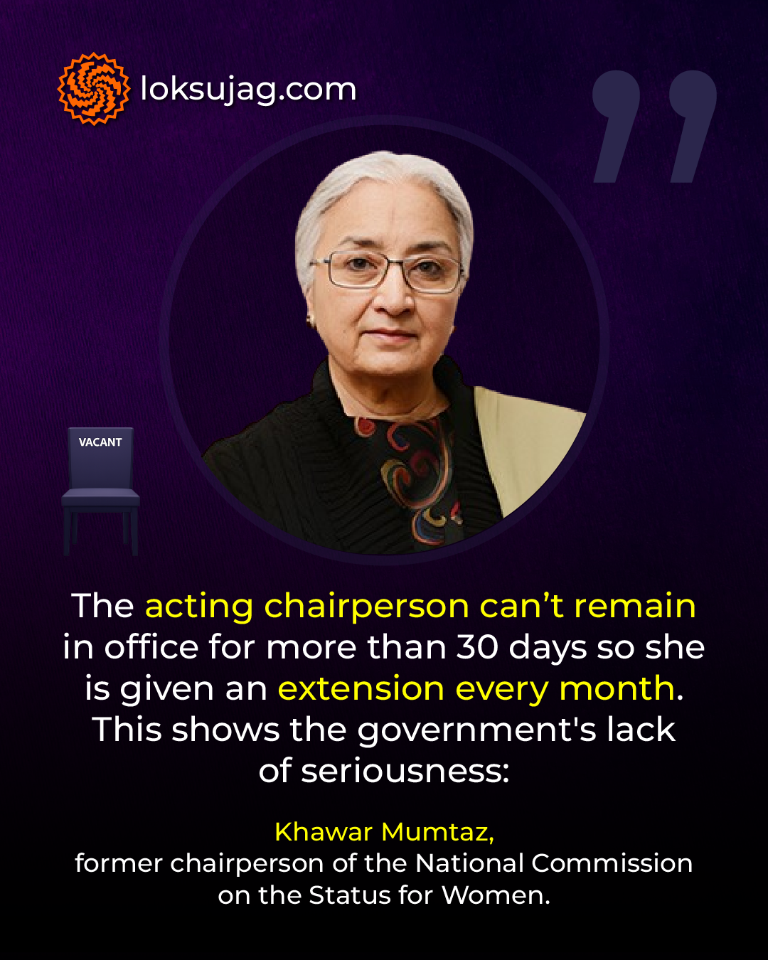 Khawar Mumtaz, who has been the chairperson of the National Commission for Women for seven-and-a-half years from 2012 to 2019, says that since the acting chairperson cannot remain in office for more than 30 days, they get an extension every month. This clearly shows the government's lack of seriousness towards the institution.