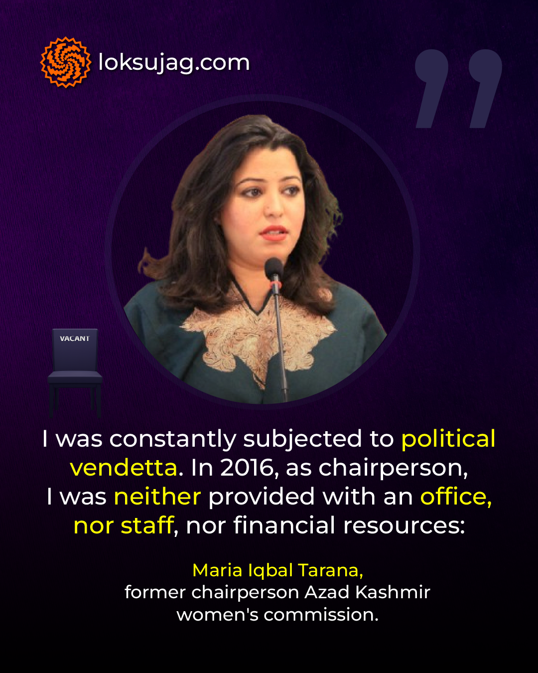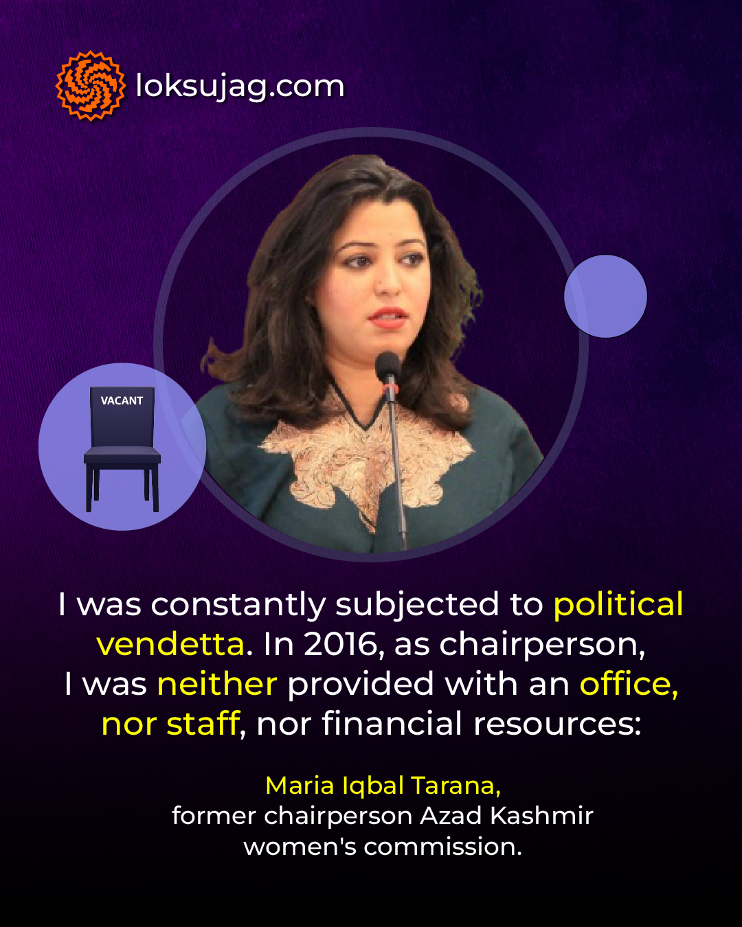 Maria Iqbal Tarana, former chairperson of the Commission on Status of Women Azad Kashmir, says she has been a constant victim of political vendetta. In 2016, she was not even given an office as chairperson nor was she provided with staff and financial resources.